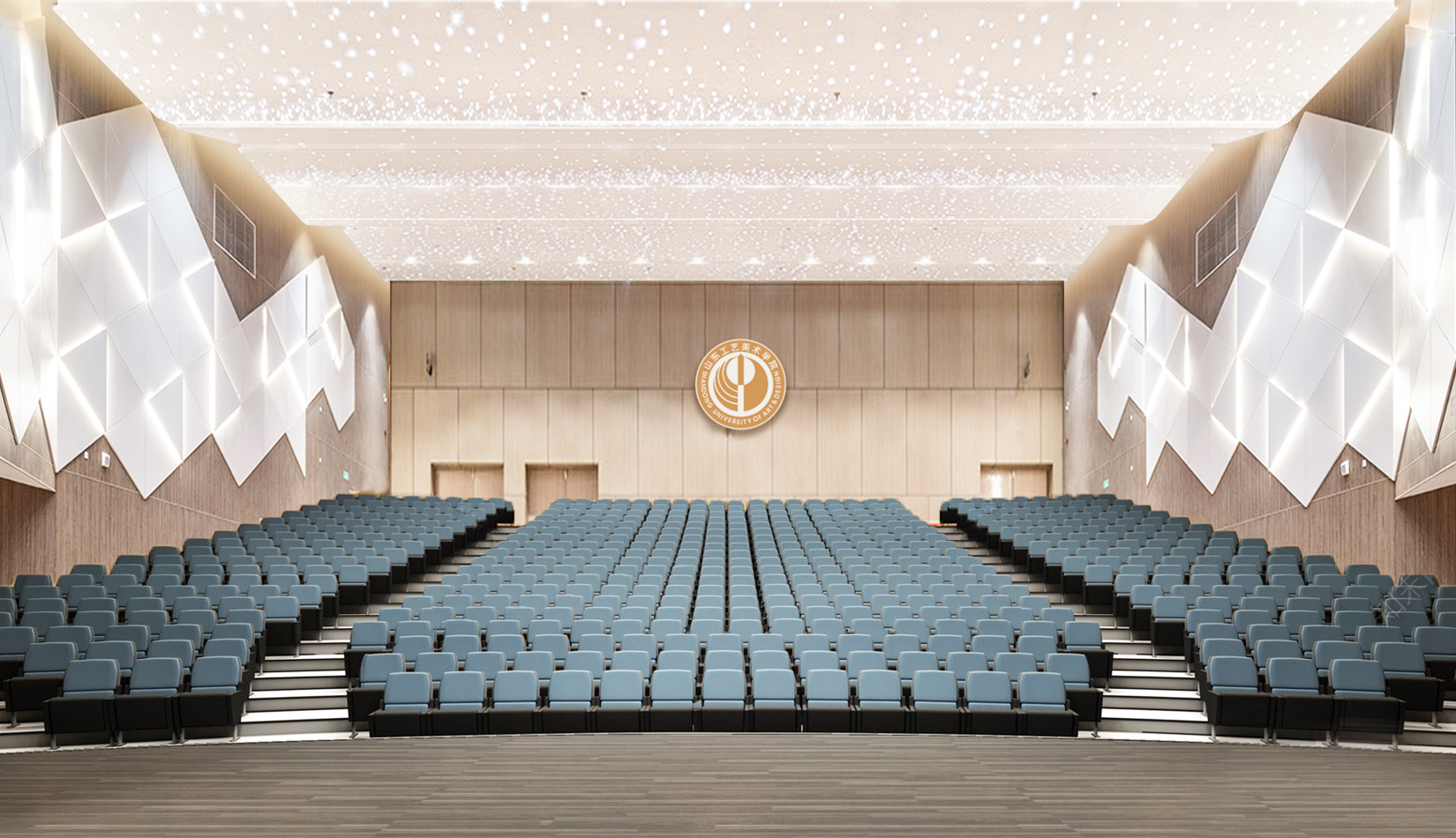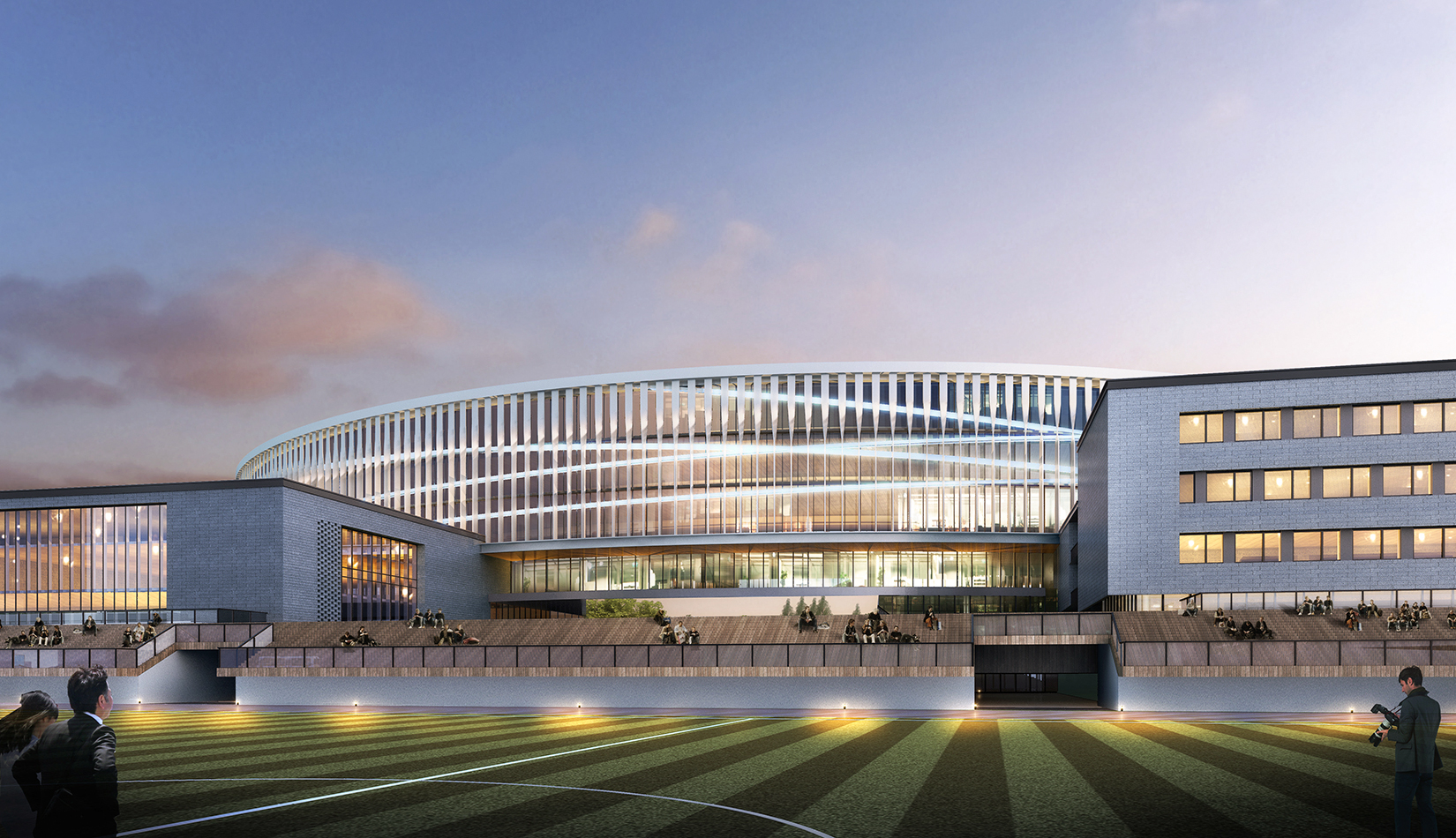 建筑方形體量運用魯班鎖的本質——榫卯結構,進行體塊塑造,將這種天人合一的工匠精神貫穿整個校園。立面材質上,采用石材及具有中國古典韻味的磚幕墻,體現學校厚重的文化底蘊?!棒敯嗑€”交織在教學綜合體所在的圓形體塊上,利用動感流線型的線條,使建筑更具有藝術氣息。