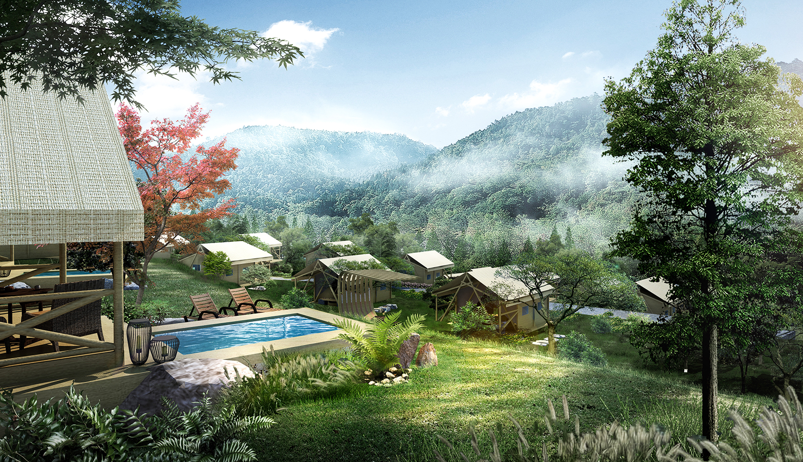根據(jù)基地的地勢(shì)分布及功能需求,空間結(jié)構(gòu)上分為“一帶兩軸三核心五組團(tuán)”。建筑設(shè)計(jì)的五個(gè)組團(tuán),分別是濱水休閑組團(tuán)、水畔風(fēng)光帳篷組團(tuán)、高端養(yǎng)心帳篷組團(tuán)、中心服務(wù)組團(tuán)及山居野趣帳篷組團(tuán)。客房部分采用帳篷度假屋的方式,凸顯野奢度假的浪漫形式。