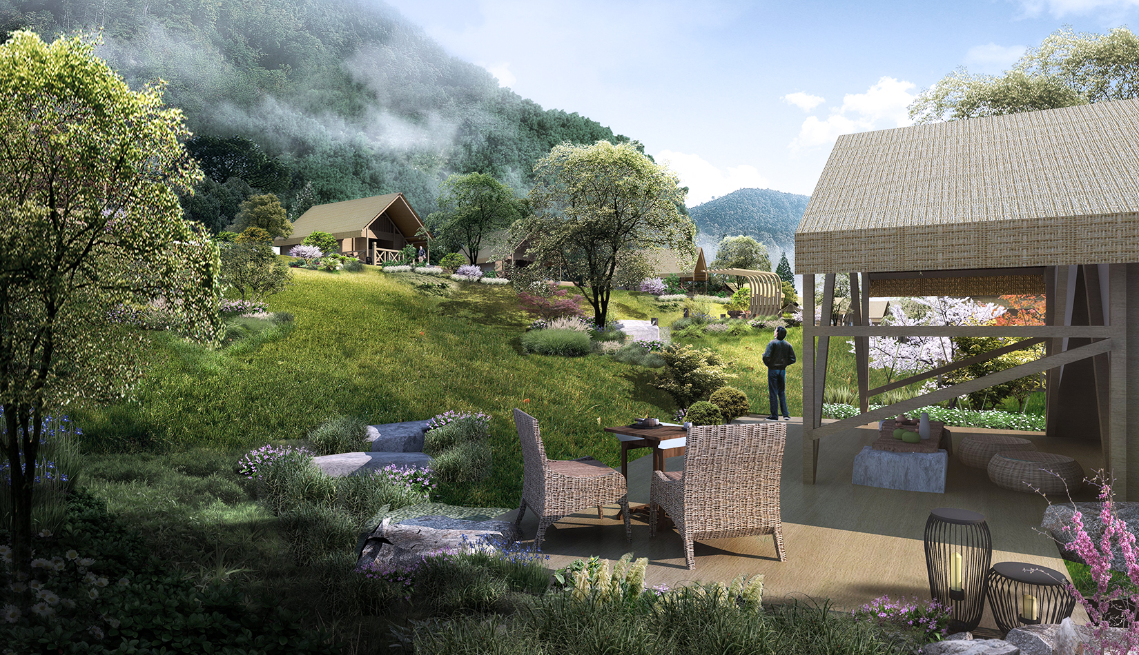 景觀設(shè)計(jì)從野奢度假酒店的“野”和“奢”兩字入手,融入荒野生態(tài)的設(shè)計(jì)理念,又要與場(chǎng)地相融合、與原生態(tài)相映、與當(dāng)?shù)氐拿袼罪L(fēng)情相交匯,突出當(dāng)?shù)氐奈幕黝},強(qiáng)調(diào)高品質(zhì)的自然、野奢度假,從而打造出一個(gè)具備個(gè)性與特色,使游客能夠享受到自然野趣體驗(yàn)的景觀環(huán)境。