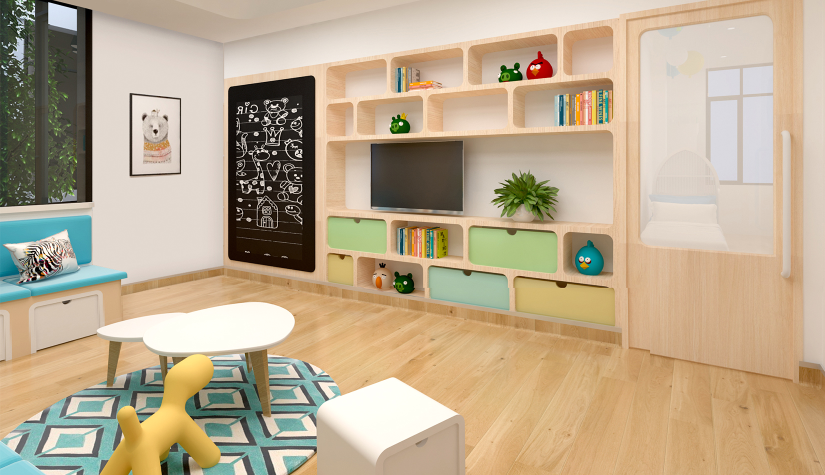 室內(nèi)延續(xù)建筑,空間內(nèi)部采光非常好。設(shè)計簡潔、現(xiàn)代,以白色為主色調(diào),搭配淺木色作為室內(nèi)顏色?;顫?、好動、天真、可愛是兒童最大的特點,在其具體功能空間設(shè)計中,我們把這些特點和空間色彩結(jié)合起來,不同的空間根據(jù)其使用功能,采用了不同的色彩搭配。