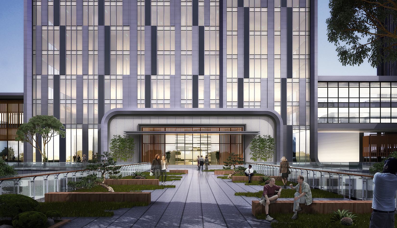 建筑圍合共享的中間庭院,庭院采用新中式風(fēng)格,屋頂設(shè)計(jì)屋頂花園,靜謐淡雅,為人們提供一個(gè)安靜休憩空間。