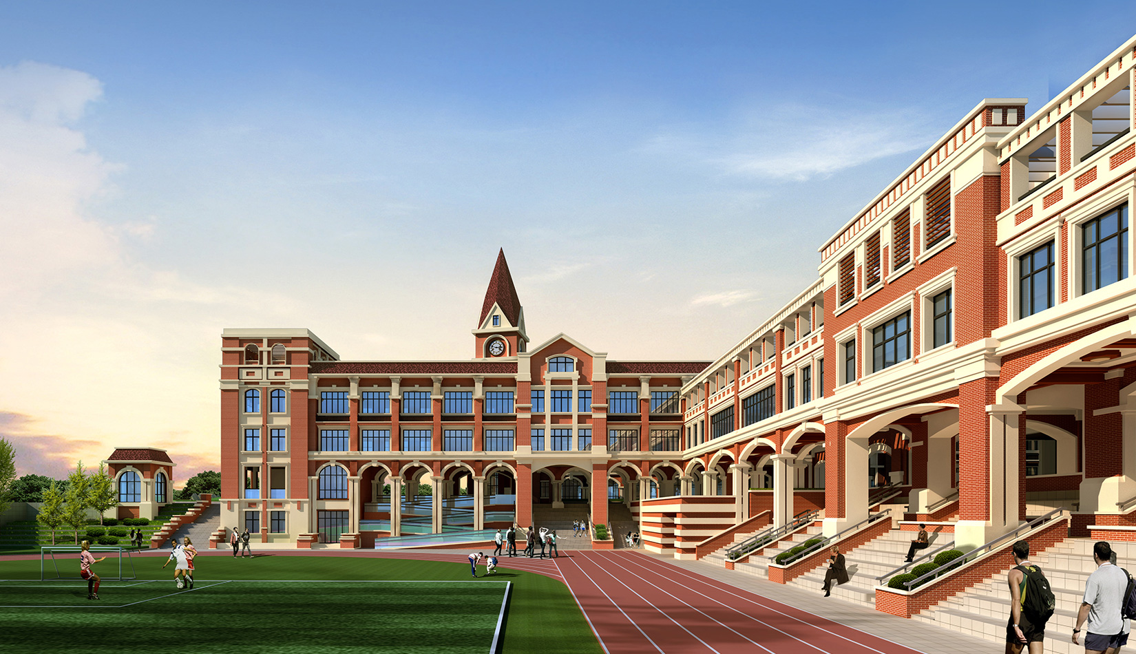 校園建筑風(fēng)格采用簡(jiǎn)約歐式風(fēng)格,以明亮、歡快的紅磚作為校園主體色調(diào),通過(guò)淺色石材、線腳的穿插勾勒建筑輪廓,形成極具特色的歐式花園式校園。