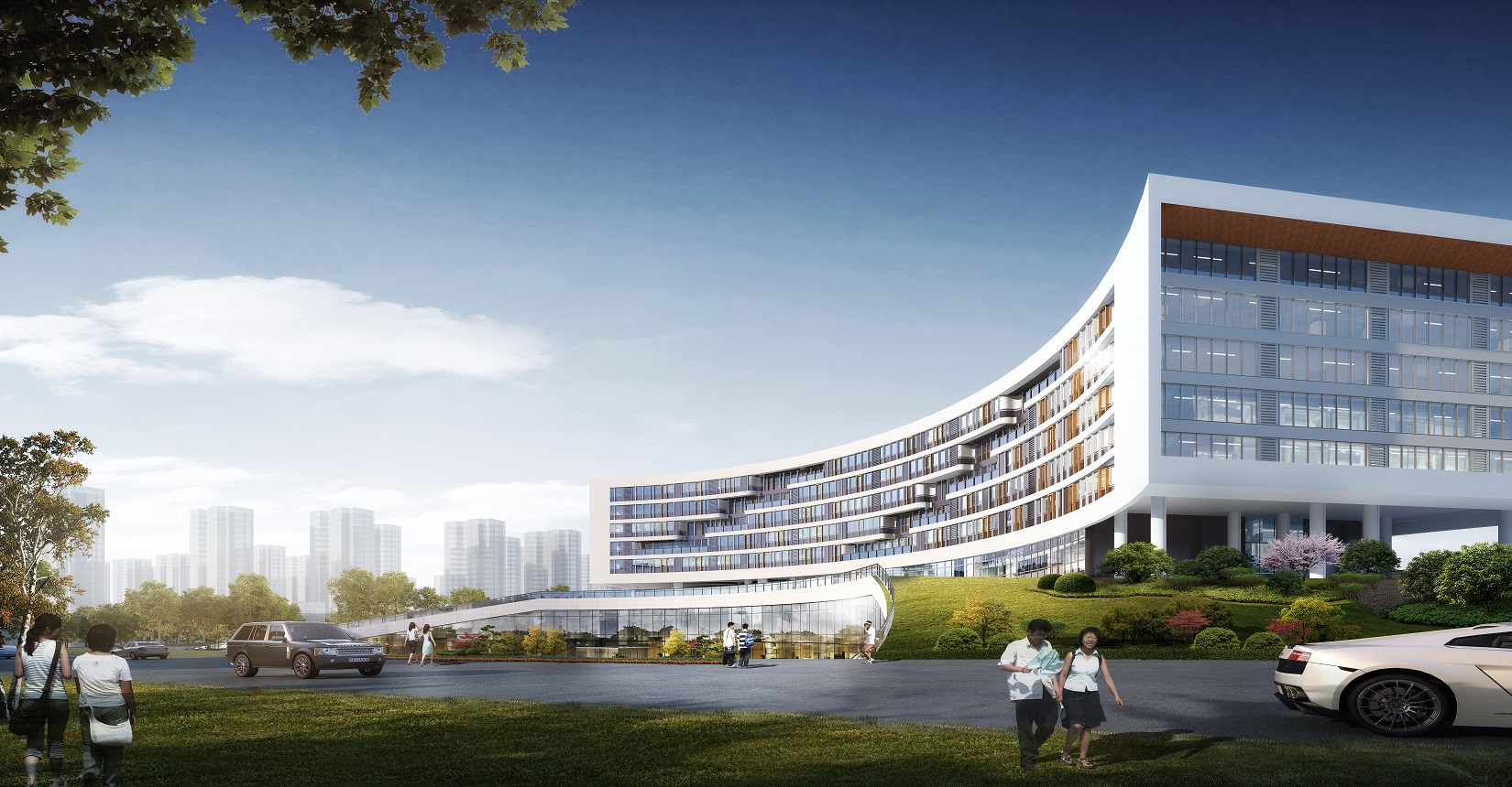 考慮到用地形狀、使用功能和日照等條件因素的影響,總平面布局以“生長(zhǎng)”為主題,寓意生命向上生長(zhǎng)的力量,生生不息,無(wú)限伸展。枝杈無(wú)限分支向上生長(zhǎng),象征著無(wú)限的力量與生機(jī)。而中醫(yī)的健康講究氣血通暢,循環(huán)往復(fù),從而衍生出“五行”相輔相成的設(shè)計(jì)理念。根據(jù)五行方位確定五行主題。將金水湖與建筑相融合,金水湖為“水”,輔“金”“木”“火”“土”四個(gè)主題廣場(chǎng)。