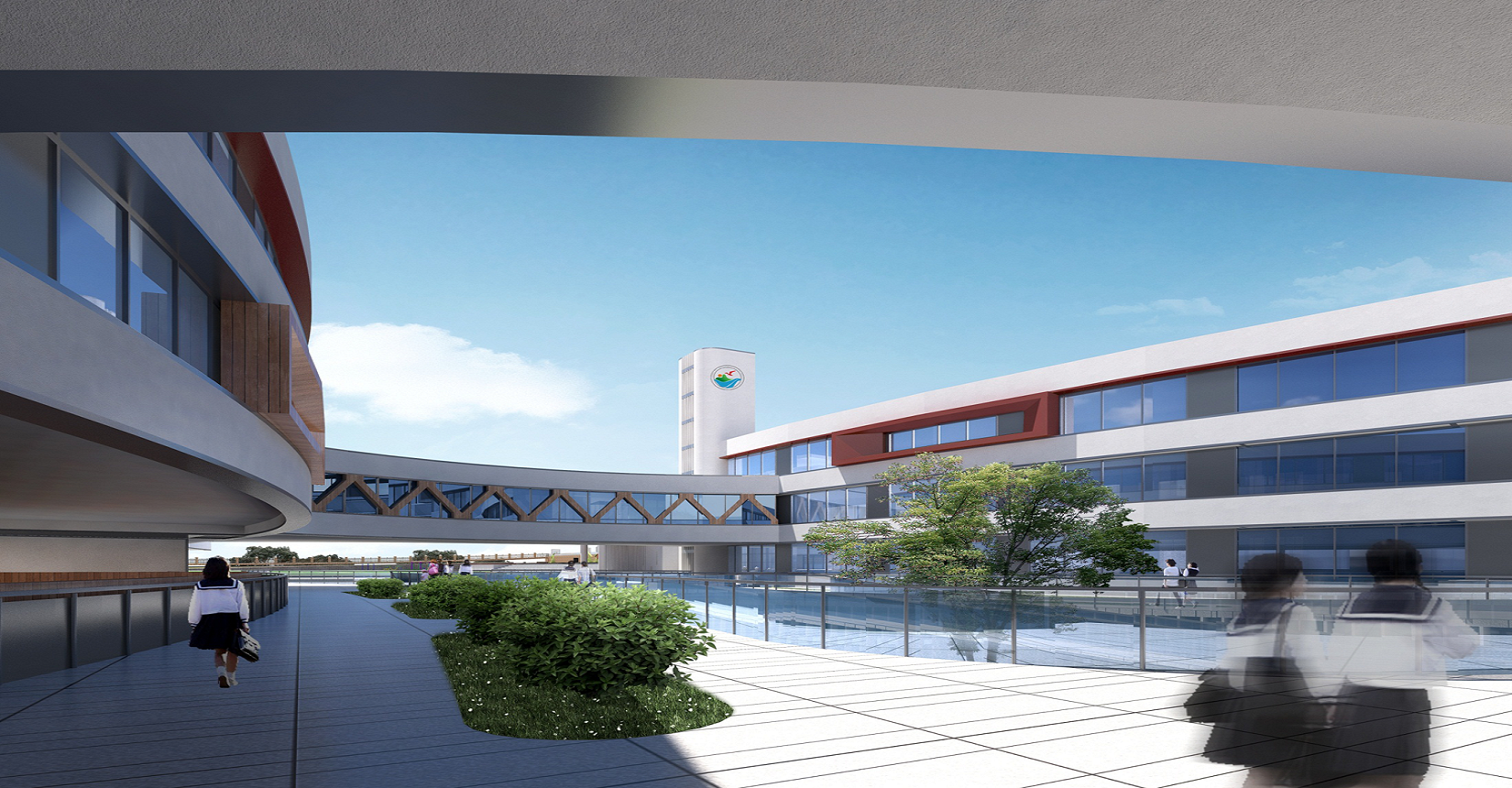 校園規(guī)劃采用曲線手法,營造流水姿態(tài),將東側(cè)山脈與西側(cè)河流連接在一起。設(shè)計(jì)現(xiàn)代化“山水”校園,使學(xué)生在自然中成長。營造活水發(fā)源的“源頭”意境,寓意教育為人類文化長河的源頭,呼應(yīng)學(xué)校“源頭”文化。曲線舒展的形體,整體采用白色色調(diào),局部以紅黃色進(jìn)行點(diǎn)綴,風(fēng)格純潔又不失活潑。
